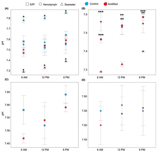 We tested the hypothesis that clams can maintain the pHe of EPF and hemolymph despite reductions in seawater pH. The expected diel cycle of the pH in natural seawater was visible, as the daily pH in the control and acidified treatments varied from 7.78 and 7.29 at 6 AM to 7.80 and 7.33 at 12 PM to 7.88 and 7.40 at 6 PM, respectively. Despite these diel variations in seawater pH, EPF and hemolymph systematically maintained different pHs from seawater for both pCO2 conditions (Figure 1A). The pHs of both EPF and hemolymph from clams maintained in OA conditions were significantly higher than the seawater pH at all measured time points (Figure 1B; p < 0.01; Student’s t-tests). Overall, EPF pH was more variable and increased in a linear relationship with that of seawater and was almost significantly different between points (p = 0.07; Figure 1B). Interestingly, the pHs of the EPF and hemolymph of clams grown under acidified seawater were similar to those measured in clams from the control conditions (Figure 1C,D; p-values < 0.05; Student’s t-test). While EPF pH tended to increase throughout the day, hemolymph pH remained constant, with no significant differences between time points.