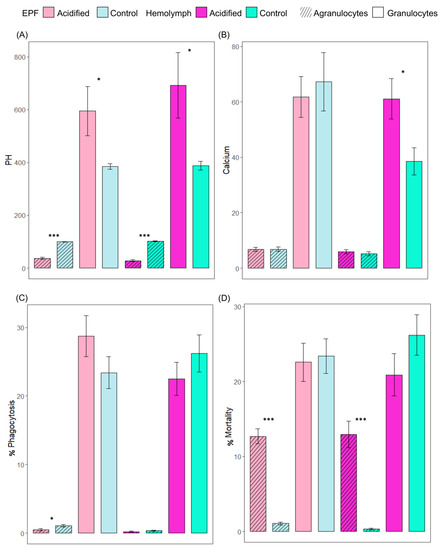 Relative fluorescence intensity of (A) BCECF-AM (indicator of intracellular pH) and (B) Fluo-3 (indicator of Ca2+), and phagocytic activity (C) for agranulocytes and granulocytes from EPF and hemolymph. (D) Cell mortality (% of PI-positive cells). Shades of pink: acidified; shades of blue: control; lighter shades: EPF; darker shades: hemolymph; diagonal lines: agranulocytes; plain bars: granulocytes. Nested ANOVAs; n = 4; means ± standard errors; asterisks denote significant differences between acidified and control clams (* <0.05; *** <0.001).