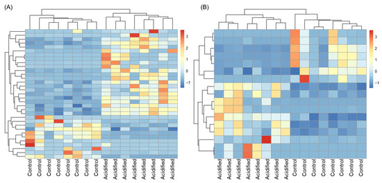 Hierarchical clustering analysis of differentially expressed genes. Over- and under-expressed genes are represented in red and blue, respectively. (A) Extrapallial fluid. (B) Hemolymph.