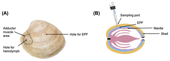 (A) Holes for accessing hemolymph and EPF. (B) Installation of sampling port.