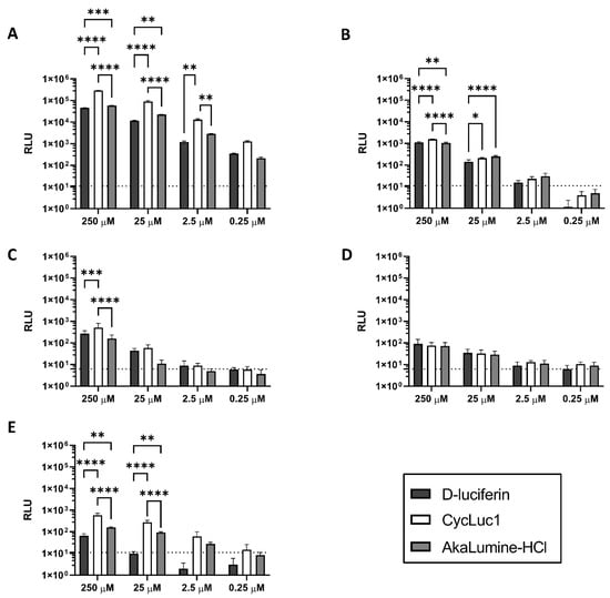 - Shinde, R.; Perkins, J.; Contag, C.H. Luciferin derivatives for enhanced In Vitro and In Vivo bioluminescence assays. Biochemistry 2006, 45, 11103–11112. [Google Scholar] [CrossRef]
