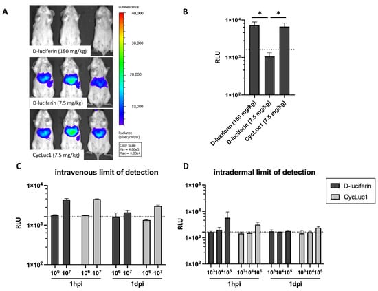 2.2. CycLuc1 Requires Lower Doses for Sensitive Leishmania Infantum Detection in Dermis and Visceral Organs