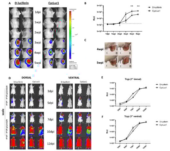 Hendrickx, S.; Bulté, D.; Mabille, D.; Mols, R.; Claes, M.; Ilbeigi, K.; Ahmad, R.; Dirkx, L.; Van Acker, S.I.; Caljon, G. Comparison of Bioluminescent Substrates in Natural Infection Models of Neglected Parasitic Diseases. Int. J. Mol. Sci. 2022, 23, 16074. https://doi.org/10.3390/ijms232416074