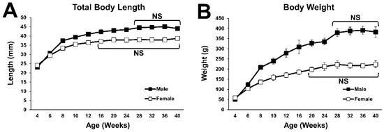 Growth curves of body size. (A) Growth curve for the total length from muzzle to tail. No statistical difference was detected between the time points at 28 weeks of age and older in males, and between the time points at 16 weeks of age and older in females. (B) Growth curve of body weight. No statistical difference was detected between the time points at 28 weeks of age and older in males, and between the time points at 20 weeks of age and older in females.