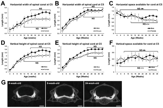 Growth curves of the spinal canal and the spinal cord at C5. (A) Growth curve for the horizontal width of the spinal canal. No statistical difference was detected between the time points at 20 weeks of age and older in males, and between the time points at 12 weeks of age and older in females. (B) Growth curve for the horizontal width of the spinal cord. No statistical difference was detected between the time points at 20 weeks of age and older in males and females. (C) Growth change of horizontal SAC. No statistical difference was detected between the time points at 6 weeks of age and older in males, and between the time points at 12 weeks of age and older in females. (D) Growth curve for the vertical height of the spinal canal. No statistical difference was detected between the time points at 20 weeks of age and older in males, and between the time points at 12 weeks of age and older in females. (E) Growth curve for the vertical height of the spinal cord. No statistical difference was detected between the time points for 24 weeks of age and older in males and females. (F) Growth change of vertical SAC. No statistical difference was detected between the time points at 8 weeks of age and older in males, and between the time points at 6 weeks of age and older in females. (G) Representative coronal computed tomography myelography (CTM) images of C5 spinal segment of a 4-, 8-, and 24-week-old female. Scale bars, 1 mm.