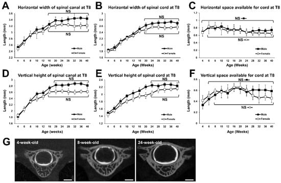 Growth curves for the spinal canal and the spinal cord at T8. (A) Growth curve of horizontal width of spinal canal. No statistical difference was detected between the time points at 16 weeks of age and older in males and females. (B) Growth curve for the horizontal width of spinal cord. No statistical difference was detected between the time points for 20 weeks of age and older in males and females. (C) Growth change of horizontal SAC. No statistical difference was detected in males, and between the time points at 6 weeks of age and older in females. (D) Growth curve for the vertical height of the spinal canal. No statistical difference was detected between the time points at 20 weeks of age and older in males, and between the time points at 16 weeks of age and older in females. (E) Growth curve for the vertical height of the spinal cord. No statistical difference was detected between the time points at 24 weeks of age and older in males and females. (F) Growth change for vertical SAC. No statistical difference was detected between the time points at 6 weeks of age and older in males, and between the time points for 8 weeks of age and older in females. (G) Representative coronal CTM images of T8 spinal segment of a 4-, 8-, and 24-week-old female. Scale bars, 1 mm.