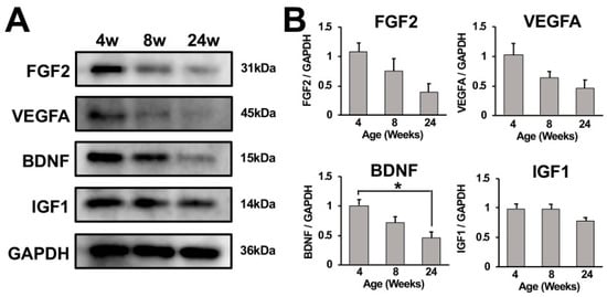 To determine whether growth factors were involved with continuous growth of the adult rat spinal cord until 24 weeks of age, expression of fibroblast growth factor 2 (FGF2), vascular endothelial growth factor A (VEGFA), brain-derived neurotrophic factor (BDNF), and insulin-like growth factor1 (IGF1) in cervical spinal cords from 4-, 8-, and 24-week-old rats were analyzed using Western blot. These growth factors were reported to maintain the differentiation potency of neural progenitor cells (NPCs) in the adult rodent nervous system [20,21,22,23,24]. All of the analyzed growth factors were expressed at the highest level at 4 weeks of age among all tested ages. Band intensities of FGF2, VEGFA, and BDNF visually decreased as rats grew, whereas the band intensity of IGF1 did not significantly decline (Figure 5A,B).