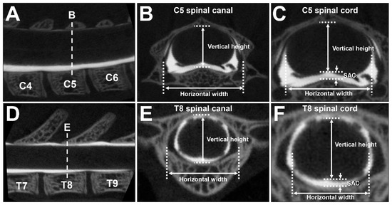 The CT images that were obtained were reconstructed at C5 and T8 for a coronal view perpendicular to the vertebral body. Among consecutive spinal canal CT images in the cranio–caudal direction, one image from the center of the stack was used for the measurements (Figure 6A,D). The dimensions of the spinal canal and the spinal cord were measured by means of R_mCT2 Image Analysis Software 1.2.1 (Rigaku, Tokyo, Japan), which was originally installed on the micro-CT instrument. The vertical heights of the spinal canal and spinal cord were measured at the midline, and the horizontal widths of the spinal canal and spinal cord were measured at the point of maximum length (Figure 6B,C,E,F). The average of three measurements was used for the analysis. The difference between the spinal canal and spinal cord for each subject was calculated as the SAC (Figure 6C,F).