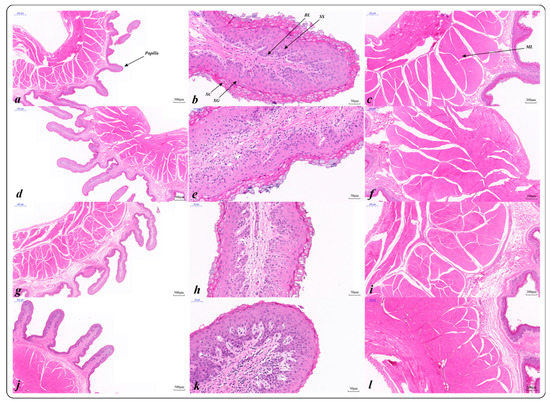 Histological characteristics of rumen epithelium of Tibetan sheep at different ages: 4 months (a–c); 1.5 years (d–f); 3.5 years (g–i); 6 years (j–l); SC: stratum corneum; SG: stratum granulosum; SS: stratum spinosum; BL: basal layer; ML: muscular layer.