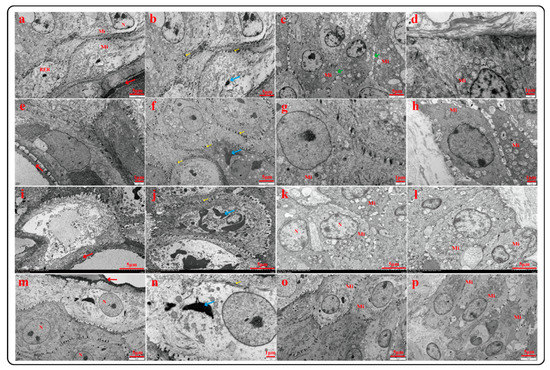 Ultrastructure of rumen epithelium of Tibetan sheep at different ages: 4 months (a–d); 1.5 years (e–h); 3.5 years (i–l); 6 years (m–p); nucleus (N), mitochondria (Mi), stratum corneum (↓), keratin granules (↓), desmosomal junctions (↓), intercellular space (↓).