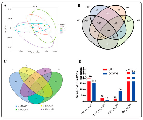 Differential mRNA analysis. (A): PCoA diagram; (B): Venn map of expressed genes; (C): differential gene Venn map; (D): up-down differential gene analysis. 4M: 4 months; 1.5Y: 1.5 years; 3.5Y: 3.5 years; 6Y: 6 years.