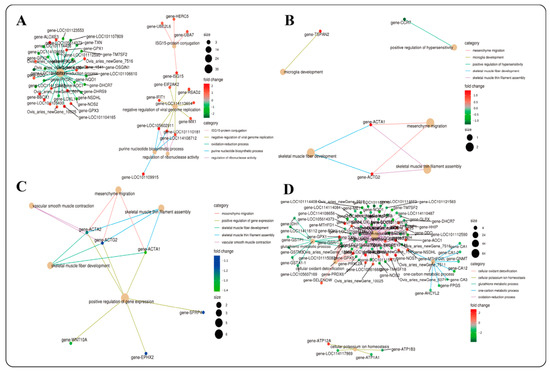 In the four comparison groups, 328 (4 months_vs._1.5 years), 38 (1.5 years_vs._3.5 years), 102 (3.5 years_vs._6 years) and 694 (4 months_vs._6 years) DEGs were annotated in the GO database. Most of them were enriched in biological processes (BP) and cellular components (CC) (Figure S1). These genes were mainly enriched in cellular process, binding, metabolic process, biological regulation, membrane part and response to stimulus, etc., and the differentially enriched genes were different among all groups. Further enrichment analysis of biological processes (BP) showed that differentially expressed genes were mainly enriched in negative regulation of viral genome replication, oxidation-reduction process, purine nucleotide biosynthetic process, ISG15-protein conjugation and regulation of ribonuclease activity in the 4 months_vs._1.5 years group (Figure 5A). In the 1.5 years_vs._3.5 years group, skeletal muscle thin filament assembly, mesenchyme migration, skeletal muscle fiber development, positive regulation of hypersensitivity and microglia development were enriched (Figure 5B). In the 3.5 years_vs._6 years group, skeletal muscle thin filament assembly, mesenchyme migration, vascular smooth muscle contraction, positive regulation of gene expression and skeletal muscle fiber development were enriched (Figure 5C). In the 4 months_vs._6 years group, oxidation–reduction process, glutathione metabolic process, one-carbon metabolic process, cellular oxidant detoxification and cellular potassium ion homeostasis were enriched (Figure 5D).