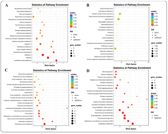 Functional enrichment analysis of KEGG. (A): 4 months_vs._1.5 years; (B): 1.5 years_vs._3.5 years; (C): 3.5 years_vs._6 years; (D): 4 months_vs._6 years.