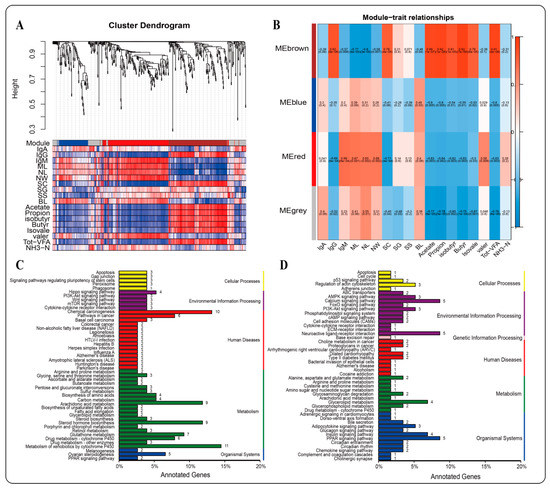 WGCNA analysis. (A): Gene-phenotype cluster; (B): WGCNA module diagram; (C): KEGG enrichment diagram (MEbrown); (D): KEGG enrichment diagram (MEred).