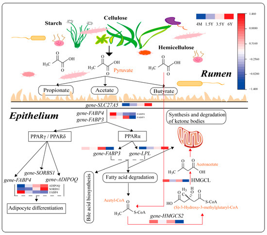 KEGG function analysis showed that rumen epithelial function was mainly enriched in arachidonic acid metabolism (ko00590) and glutathione metabolism (ko00480) from 4 months to 1.5 years of age, which was related to the resistance to peroxide damage and may have boosted the body’s immunity [46]. Because of the high intensity of ruminal development from 4 months to 1.5 years of age, the immunity of the rumen epithelium may be improved. The ages 1.5 and 3.5 years old are the stages of youth and adulthood, functions are mainly enriched in vascular smooth muscle contraction (ko04270), tight junction (ko04530) and other pathways, and among them, the enriched gene ACTG2 is the main component of the contractile organ, which improves the contraction and peristalsis of rumen muscle layer [45]. Second, IGSF5 is involved in the tight junctions of the rumen epithelium [47], which improves the epithelial barrier. In the old age stage from 3.5 to 6 years old, the genes were mainly enriched in arachidonic acid metabolism (ko00590), metabolism of xenobiotics by cytochrome P450 and steroid hormone biosynthesis, which is related to resistance to peroxide damage [46], and immunity was decreased in the old age of 6 years. In addition, it was enriched in the butanoate metabolism pathway, which is a ketogenic metabolism pathway that provides lipid-derived energy for various organs. It has been reported that ACAT1 and HMGCS2 isoforms are highly correlated with rumen ketogenesis [48,49]. As shown in Figure 9, the expression of HMGCS2 is consistent with the concentration of VFAs, and they are involved in the generation and metabolism of ketone bodies through the pyruvate-acetyl-CoA pathway. In addition to 4-month-old lambs, 3.5-year-old sheep are also significantly enriched in ketogenic metabolic pathway for energy supply to better adapt to the plateau environment. In the 4 months_vs._6 years group, the DEGs were mainly enriched in glutathione metabolism (ko00480) and metabolism of xenobiotics by cytochrome P450 (ko00980), and the enriched genes were downregulated, thus leading to a decrease in immunity.