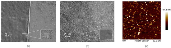 The bR film prepared using the DC technique showed a relatively uniform morphology with no significant defects observed (Figure 1a), indicating the uniform dispersion of the bR molecules in the aqueous solution and the solid attachment of the bR molecules onto the ITO glass substrate. A clear boundary between the area covered with the bR film and the area not covered is likely the result of the “coffee ring effect” during the evaporation process of the solvent. The bR film prepared by the EPS technique showed a less clear boundary and an uneven distribution of bR fragments (Figure 1b). This is likely due to the uneven distribution of the electric field. For the bR film prepared using the LBD technique, the amount of bR molecules transferred was insufficient to be detected by SEM; therefore, the AFM imaging was used to characterize the morphology (Figure 1c). The AFM image indicates the even distribution of the bR molecules with an average surface roughness Ra = 7.58 nm, and the peak height of 97.3 nm corresponds to the three-layer bR film, indicating the successful transfer of the bR molecules.