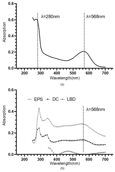 The retinal contained in the bR molecules undergoes photoisomerization under illumination, which leads to the protonation and deprotonation of the Schiff base and eventually the translocation of the proton [37]. The retinal has an absorption peak at approximately 568 nm [38]. Hence the UV-VIS absorption spectroscopy is often used to specifically identify the bR molecule. The bR solution shows an absorption peak near 568 nm, and the A280/A568 of 2.87 indicates a high purity (Figure 2a). In Figure 2b, the UV-VIS absorption spectrum of the bR films immobilized using the three techniques was presented. The bR film prepared using the DC technique showed an absorption peak at 568 nm, and the bR film immobilized using the EPS technique showed an absorption peak at 562 nm, both close to that of the bR solution, indicating that the optical characteristics were well preserved after the immobilization process. The bR film immobilized using the LBD technique, however, showed a low absorption in the entire scan range, and no absorption peak was observed near 568 nm. This could be caused by the tiny amount of the bR molecule transferred to the ITO substrate: during the process of the LBD technique, most of the bR molecule was dispersed on the subphase surface instead of being transferred to the ITO substrate. This characteristic impedes the application of the LBD technique in the industrial-scale production, as the waste of raw materials is undesirable, considering the economic efficiency.