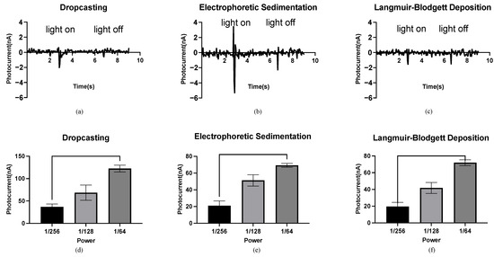 The relationship between the light intensity and the photocurrent of the bR films is shown in Figure 3d–f. The horizontal axis represents the fraction of the maximum power (76 W) of the photoflash, and the vertical axis represents the maximum measured photocurrent. For the bR films immobilized using the DC/EPS/LBD techniques, the peak photocurrent increased with an increase in the power output, and the significant differences between the photocurrents under three levels of power output were observed. This feature of monotonicity makes the bR films an ideal material for the fabrication of light intensity detection devices, and the independence of this feature from the immobilization techniques means that the fabrication process can be implemented with more flexibility but fewer requirements.