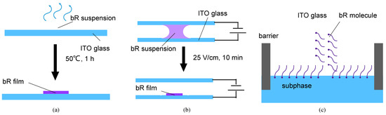 Schematics of the different immobilization techniques. (a) Schematics of dropcasting. Evaporation of the solvent leaves a dry bR film on the ITO glass. (b) Schematics of electrophoretic sedimentation. The bR molecules move toward the ITO glass under the effect of an electric field, simultaneously forming a unified orientation at the same time. (c) Schematics of the Langmuir–Blodgett deposition. The amphiphilicity of the bR molecules leads to an oriented monolayer on the aqueous subphase, which is then transferred onto the ITO glass substrate.