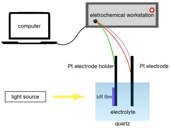 The photocurrent response of a photocell is an important parameter for characterizing the photoelectric response of a bR film. A three-electrode photovoltaic cell was fabricated as follows: the working electrode was ITO glass covered with bR film clamped on a Pt electrode holder; the counter electrode and the reference electrode were made of Pt electrodes and the electrolyte was a mixture of 20 mM KCl and 2 mM KH2PO4 (pH = 8). Note that the photovoltaic cell was merely constructed to measure the photoelectric response of the bR films at the laboratory level and did not impose restrictions on the industry-scale production of the photovoltaic cells: other electrode materials and electrolytes can be implemented. The fabricated photovoltaic cell was connected to an electrochemical workstation (CHI660E, Shanghai Chenhua Instrument, Shanghai, China) to study its photoelectric response in an amperometric i-t mode (Figure 5).