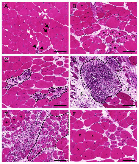 Fibre size variation is one of the most prominent features of dystrophic muscles [43]. While in healthy muscles, fibres have roughly similar size, peripherally located nuclei and almost no connective tissue in the perimysium and endomysium (Figure 2A), muscles from patients with DMD and animal models of the disease show highly variable diameters of their myofibres. Depending on the age and degree of physical activity of the individual, some or all of the following features are evident in these muscles: clusters of necrotic fibres with basophilic inflammatory cells inside and fragmented sarcoplasm (Figure 2B), densely stained hypercontracted fibres (Figure 2B), mild or severe cell infiltration (Figure 2C,D, respectively), groups of small rounded muscle fibres in an early stage of regeneration or immaturity (Figure 2E), normally scattered with medium-sized healthy fibres and hypertrophic ones (Figure 2F) [19]. Since early regenerating fibres or myotubes are formed by the fusion of several activated myoblasts, fibres that have undergone necrosis and regeneration, but are still not fully mature, are centrally nucleated (see Section 3.3) [44]. The presence of fibrotic and adipose tissue within fibres is also evident with this stain (Figure 2D), especially in aged individuals. However, for the evaluation of the latter, more specific dyes must be used (see Section 3.8).