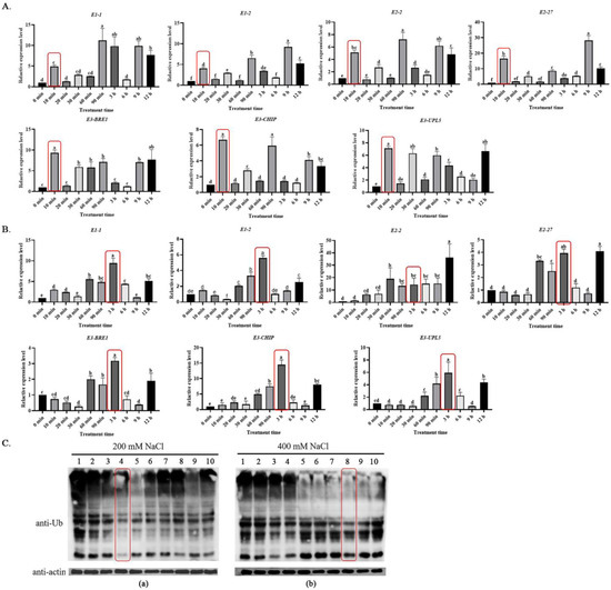 Gene transcription and protein level responses of the ubiquitin system in the roots of sugar beet M14 after salt stress treatments. (A) qRT-PCR of key genes in the ubiquitin system after 200 mM NaCl treatment. (B) qRT-PCR of key genes in the ubiquitin system after 400 mM NaCl treatment. The red-rectangle-enclosed bars represent the initial response time of key enzyme genes in the ubiquitin system to salt stress. Data were analyzed by Duncan’s analysis of variance, and different lowercase letters (a, b, c, d, e, f) indicate differences in genes expression. (C) Western blot analysis of protein ubiquitination levels after (a) 200 mM NaCl and (b) 400 mM NaCl treatments. The red-rectangle-enclosed lanes represent the point in time when the overall ubiquitination protein was significantly reduced. Lanes 1–10 represent the samples after different times of NaCl treatment, respectively: 1, 0 min; 2, 10 min; 3, 20 min; 4, 30 min; 5, 60 min; 6, 90 min; 7, 3 h; 8, 6 h; 9, 9 h; 10, 12 h. Different letters above bars denote statistical differences.
