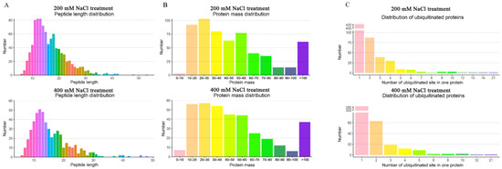 Distribution characterization of the identified ubiquitinated proteins. (A) Length distribution of the identified peptides derived from proteins in the roots of the sugar beet M14 line. (B) Mass distribution of the identified proteins in the sugar beet M14 line. (C) Distribution of the ubiquitination sites in the identified peptides derived from proteins in the sugar beet M14 roots. (Top panel), 200 mM NaCl treatment; (Bottom panel), 400 mM NaCl treatment.