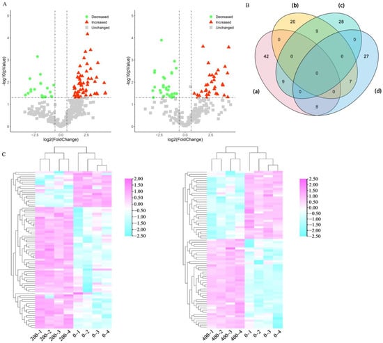 Quantitative analysis of the DEUPs. (A) Volcano plots of the DEUPs under 200 mM NaCl treatment (left panel) and 400 mM NaCl treatment (right panel). (B) Venn diagram of the DEUPs: (a) increased DEUPs under 200 mM NaCl treatment; (b) decreased DEUPs under 200 mM NaCl treatment; (c) increased DEUPs under 400 mM NaCl treatment; and (d) decreased DEUPs under 400 mM NaCl treatment. (C) Heat map of the hierarchical clustering of the DEUPs under 200 mM NaCl treatment (left panel) and 400 mM NaCl treatment (right panel).