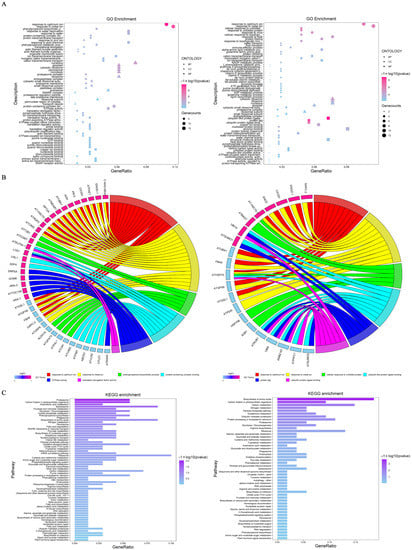 Bioinformatics analysis of the DEUPs. (A) GO enrichment bubble chart of the DEUPs ((left panel), 200 mM NaCl; (right panel), 400 mM NaCl). See Table S6 for specific notes. (B) Ubiquitinated protein distribution of main enrichment pathways (pink, increased ubiquitinated proteins; blue, decreased ubiquitinated proteins). (C) KEGG enrichment of the DEUPs ((left panel), 200 mM NaCl; (right panel), 400 mM NaCl). Refer to Table S7 for detailed information.