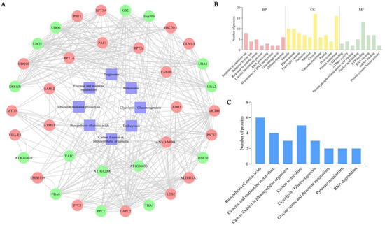 A KEGG annotation of the co-modified proteins was performed, and the results are shown in Figure 5C. Under salt stress conditions, the co-modified proteins were involved in amino acid biosynthesis; cysteine and methionine metabolism; carbon fixation in light and biology; carbon metabolism; glycolysis/gluconeogenesis; glycine, serine, and threonine metabolism; pyruvate metabolism; and RNA degradation. The results indicate that proteins related to amino acid synthesis as well as carbon-metabolism-related pathways are susceptible to coregulation by ubiquitination and phosphorylation modifications under salt stress.