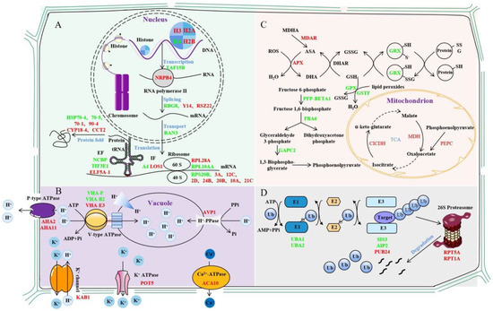 Mechanisms of ubiquitinated protein changes in sugar beet roots under different concentrations of salt stress. (A). Mechanism of transcriptional and translational regulation of ubiquitination in sugar beet M14 line in response salt stress. (B). Mechanism of signal transduction regulation of ubiquitination in sugar beet M14 line in response salt stress. (C). Mechanism of metabolism pathway regulation of ubiquitination in sugar beet M14 line in response salt stress. (D). Mechanism of UPS regulation of ubiquitination in sugar beet M14 line in response salt stress. Red represents increased ubiquitinated proteins, and green represents decreased ubiquitinated proteins.