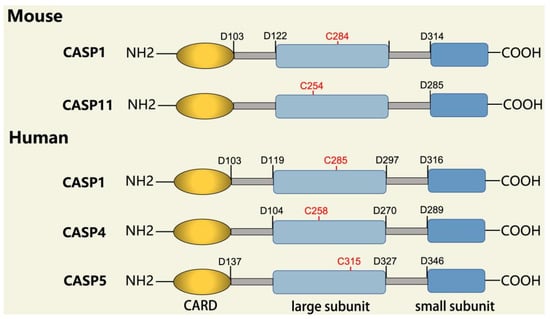 Domain structure of mouse (caspases-1, -11) and human (caspases-1, -4, -5) inflammatory caspases. A CDL connects N-terminal CARD to the protease domain that is composed of a large subunit (p20) and a small subunit (p10) separated by an IDL. Each caspase contains some autocleavage sites (black site) within the linker sequences. The catalytic cysteine (red site) is located within the large protease subunit, while the dimerization interface is within the small subunit.