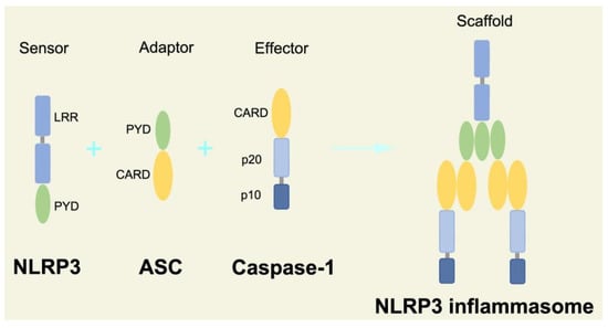 The canonical inflammasome is a kind of multiprotein complex that mediates innate immune response in mammals. Its most prominent function is to recruit and activate caspase-1, promote the maturation of IL-1β and IL-18, and then generate inflammatory response. The inflammasome consists of NOD-like receptors (NLRs), apoptosis-associated Speck-like protein containing a CARD (ASC), and caspase-1 [,,,]. There are four intracellular receptor proteins to assemble the inflammasome, including NOD-like receptor protein 1 (NLRP1), NOD-like receptor protein 3 (NLRP3), NOD-like receptor C4 (NLRC4), and absent in melanoma 2 (AIM2) inflammasome []. The receptor is composed of three homologous domains: the N-terminal pyrin domain (PYD), the central nucleotide-binding oligomerization domain, and the C-terminal leucine repeat (LRR) []. In the process of canonical inflammasome assembly, NLRP3 recruits ASC through interaction with homotypic PYD domain and induces ASC to aggregate into macromolecular spots []. Subsequently, the assembled ASC recruits pro-caspase-1 through homotypic card domain interaction to form NLRP3-ASC-caspase-1 protein complex [] that is known as NLRP3 inflammasome consisted of “sensor”, “adaptor”, and “effector” (Figure 2), respectively [].