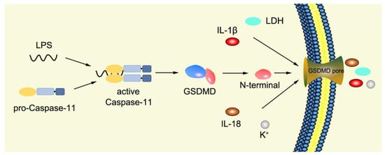 In the noncanonical pathway of pyroptosis, the complex of LPS-pro-caspase-11 was recognized as a noncanonical inflammasome, and LPS directly activates caspase-11, which is independent to TLR4 signaling pathway []. When caspase-11 mediates noncanonical pyroptosis, it leads to cleavage of GSDMD, and GSDMD-N executes pyroptosis to induce the release of cell contents. However, noncanonical pyroptosis still requires the help of the NLRP3 inflammasome that activates caspase-1 to induce maturation of pro-IL-1β and pro-IL-18 [].