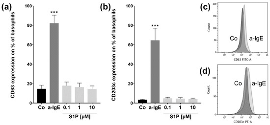 Since atopy is mostly associated with IgE-mediated degranulation of basophils, we investigated if the stimulation of S1P receptors with different concentrations of S1P had an effect on the basophil degranulation assessing markers CD63 and CD203c, which are markers for anaphylactic and piecemeal degranulation, respectively. The number of CD63-positive basophils significantly increased after stimulation with the positive control a-IgE (p < 0.001; a-IgE: 82.2% ± 8.26; Co: 14.7% ± 3.78) (Figure 2a). A similar increase could be observed in the number of CD203c-positive basophils after stimulation with a-IgE (p < 0.001; a-IgE: 64.6% ± 12.45; Co: 3.4 & ± 0.43) (Figure 2b). The shift in marker expression is further visualized in Figure 2c,d. The three different doses of S1P had no significant effect on CD63 or CD203c expression. Thus, S1P-inducing degranulation in basophils is unlikely.