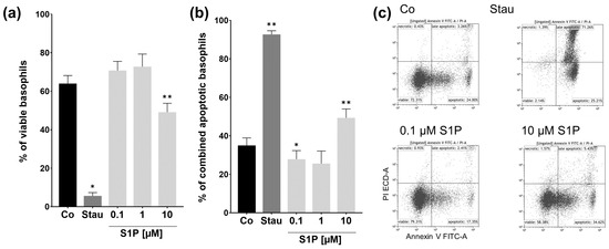As the preceding experiments suggest that stimulation with S1P does not cause an immediate effect or reaction in basophils, we wanted to investigate what effect might be observable after longer incubation periods. Due to the fact that basophils have a relatively short lifespan of about 1 to 2 days in the peripheral blood, the possibility of S1P influencing this lifespan and, therefore, apoptosis came to mind. Hence, we performed an annexin V-FITC and PI apoptosis assay after incubation with stimuli for 24 h. Annexin V-FITC was used to stain the apoptosis marker phosphatidylserine, and PI to stain nucleic acids to together determine the stages of apoptosis. Percentages of viable cells (Figure 4a) and combined apoptotic cells (apoptotic + late apoptotic) (Figure 4b) were analyzed individually. The numbers of necrotic cells were not analyzed, as they are only measurable for a very brief period of time before losing all markers assessed in the assay. The average percentage of viable cells in the apoptosis-inducing staurosporine (Stau) positive control group was significantly lower than the mean of the unstimulated control group (p = 0.0101, Stau.: 5.6% ± 1.73; Co: 64% ± 4.17). The number of viable 10 µM S1P treated basophils was also markedly decreased in comparison to the control group (p = 0.0012, 10 µM S1P: 49.1% ± 4.67; Co: 64% ± 4.17). This was also reflected in the combined apoptotic populations. The mean number of apoptotic cells dramatically increased for staurosporine treated basophils, and for 10 µM S1P treated cells (Co: 35% ± 3.89; Stau: p = 0.0098, 92.7% ± 1.89; 10 µM S1P: p = 0.0029, 49.3% ± 4.65). Interestingly, the percentage of apoptotic basophils decreased in basophils stimulated with 0.1 µM S1P (p = 0.0418, 0.1 µM S1P: 27.8% ± 4.48; Co: 35% ± 3.89). A similar trend was observable for 1 µM treated basophils, though this value is not statistically significant. This trend was also reflected in the slightly increased number of viable basophils for lower S1P concentrations (0.1 and 1 µM). These results suggest that high doses of S1P have an apoptotic effect on human basophils, while the low dose of 0.1 µM seems to possess anti-apoptotic properties.