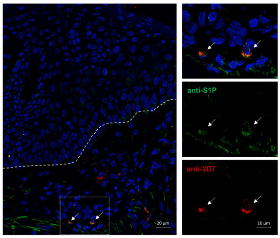 We were able to show that basophils react to S1P in various ways and that the lipid has an effect on the disease pathophysiology of atopy. Therefore, we wanted to investigate if basophils are a source of S1P that could act in autocrine manners. In the immunofluorescence staining of an AD skin biopsy with anti-S1P and the basophil identifying anti-2D7, we could identify two basophils in the dermis of the sample that were S1P positive (Figure 6).