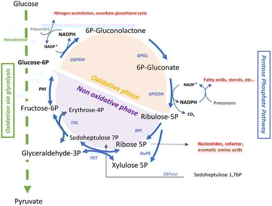 Plant performance intrinsically depends on balanced carbon flux through interconnected metabolic hubs. Glucose-6-phosphate dehydrogenases (G6PDHs) catalyze a metabolic node between glycolysis and the pentose phosphate pathway (PPP), i.e., the oxidation of glucose -6-phosphate (G6P)—A substrate generated by hexokinase during glycolysis—to 6-phosphogluconolactone, concomitant with the production of the reductant nicotinamide adenine dinucleotide phosphate (NADPH). This reaction is considered as the rate-limiting step of the oxidative pentose phosphate pathway (OPPP), and controls OPPP-dependent carbohydrate allocation [1,2,3]. The PPP is divided into two branches with two distinct functions. The OPPP is the irreversible oxidative branch of the PPP. It comprises three irreversible reactions that convert glucose 6 phosphate (G6P) into carbon dioxide (CO2) and ribulose-5-phosphate (Ru5P, a pentose phosphate) while two molecules of NADPH are produced (Figure 1). Ru5P becomes the substrate of the reversible non-oxidative phase (NOPPP), which is the reversible branch of the PPP. The second branch is the non-oxidative pentose pathway (NOPP). It is composed of reversible transaldolase and transketolase reactions enabling the cell to control carbon flux between the PPP and glycolysis [3,4,5,6]. Including two NADPH-producing steps, the OPPP is the main provider of reductant (NADPH) for “reductive” biosynthetic reactions (e.g., assimilation of inorganic nitrogen, fatty acid synthesis) and for ROS scavenging. The NOPPP rather provides precursors (ribose-5-phosphate; erythrose-4-phosphate) for aromatic amino-acid, nucleotide, and cofactor synthesis [3,6]. The OPPP is an almost ubiquitous pathway, present in all eukaryotic cells and most bacteria, and seems to be more recent than the NOPPP in evolution [3,5].