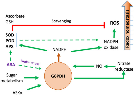 As sessile organisms, plants have to cope with various abiotic stresses such as salinity, drought, or temperature changes [105]. G6PDHs play a crucial function in modulating redox homeostasis when plants are exposed to abiotic stresses [3,106,107,108]. Some researchers found the role of a cytosolic G6PDH (NbG6PDH-Cyto) and two plastidial isoforms of G6PDH (NbG6PDH-P1 and NbG6PDH-P2) in the stress physiology of Nicotiana benthamiana [109]. ROS production in link with hypersensitive-response (HR) cell death and NADPH oxidase (NOX, also known as respiratory burst oxidase, RBOH) activity decreased in NbG6PDH-P2-silenced plants. Silencing of the cytosolic NAD kinase NbNADK1, which phosphorylates NADH to NADPH, compromised HR cell death and ROS production. The concomitant silencing of NbG6PDH-P2 reduced HR cell death and ROS down to levels near those of NbG6PDH-P2-silenced plants. These authors suggested that NADPH produced by NbG6PDH-P2 was responsible for HR cell death and ROS production mediated by RBOH. Increased G6PDH activity could also stimulate ROS generation by regulating NADPH oxidase activity in rice [110]. G6PDH may be involved in maintaining redox homeostasis by regulating the activity of superoxide dismutase (SOD), peroxidase (POD), and ascorbate peroxidase (APX) [111,112,113]. Treatment with Acibenzolar-S-methyl (an inducer of disease resistance in plants) increased G6PDH activity and the ascorbic acid (AsA) level, while the GSH and NADPH contents and the expression level of redox homeostasis-related genes such as SOD, APX, or dehydroascorbate reductase (DHAR) were reduced [114]. G6PDH activity markedly increased in soybean under drought stress [115]. Upon PEG6000 treatment, the activity of the antioxidant enzymatic machinery (superoxide dismutase (SOD), catalase (CAT), peroxidase (POD), glutathione reductase (GR), dehydroascorbate reductase (DHAR), monodehydroascorbate reductase (MDHAR)) increased in soybean, and GSH and ascorbic acid (AsA) reached elevated levels; once again, these results demonstrate that G6PDH plays a central role in redox homeostasis by maintaining the GSH and Asc levels.