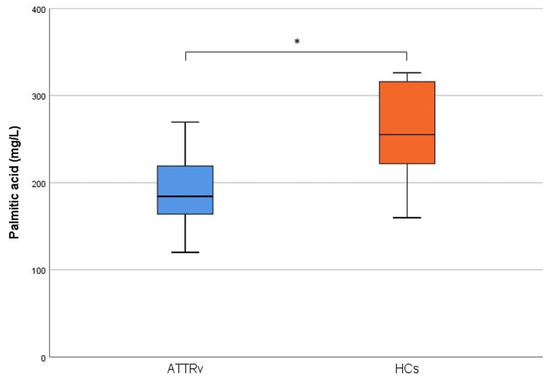 Palmitic acid levels in ATTRv patients and healthy controls, * refers to significant statistically difference (p = 0.002).