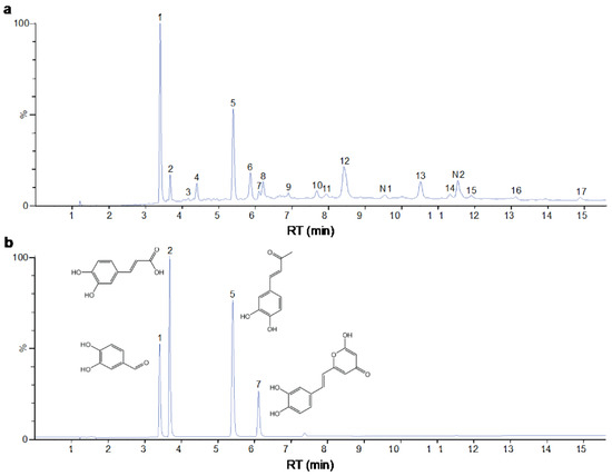 (a) UV chromatogram of PBP at 254 nm. (b) UV chromatogram of mixed standards of protocatechuic aldehyde, caffeic acid, osmundacetone and hispidin.