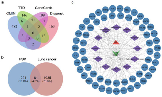 Potential targets information of 17 active compounds of PBP were collected from TCMSP database (https://old.tcmsp-e.com/tcmsp.php (accessed on 10 November 2022)) [49] and Drugbank database (https://go.drugbank.com/ (accessed on 10 November 2022)) [50]. Lung cancer-treat targets were collected from 4 databases using the keyword ‘lung cancer’: GeneCards database (https://www.genecards.org/ ((accessed on 10 November 2022))) [51], Human Online Mendelian Inheritance database (OMIM, https://www.omim.org/ ((accessed on 10 November 2022))) [52], DisGeNET database (https://www.disgenet.org/ ((accessed on 10 November 2022))) [53] and TTD (http://db.idrblab.net/ttd ((accessed on 10 November 2022))) [54]. The intersection of PBP active component targets and lung cancer-related targets is regarded as the potential targets for PBP treatment of lung cancer. Visualization using Venny 2.1 (https://bioinfogp.cnb.csic.es/tools/venny ((accessed on 10 November 2022))).