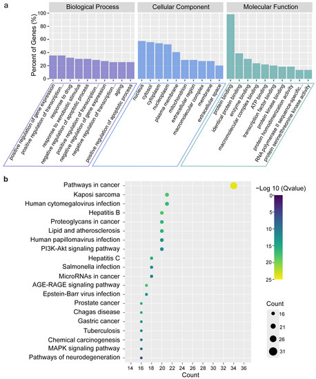 Analysis of GO and KEGG enrichment to identify the anti-tumor mechanisms. (a) The top 10 in BP terms, CC terms, and MF terms of the GO terms (p < 0.05); (b) The top 20 KEGG pathways (p < 0.05).