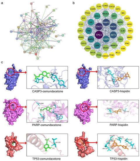 Identification and molecular docking verification of PBP anti-lung cancer core targets. (a) PPI network diagram obtained by STRING database analysis (interaction score > 0.9); (b) Visualizing the PPI network was completed using Cytoscape 3.9.1; (c) The docking mode of CASP3- osmundacetone, PARP-osmundacetone, TP53-osmundacetone, CASP3-hispidin, PARP-hispidin and TP53-hispidin.