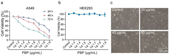 Cytotoxicity of PBP to A549 cells. (a) A549 cells viability was assayed using the CCK-8 assay, after being exposed to varying amounts of PBP for 24, 48, and 72 h; (b) Cytotoxicity of PBP to HEK293 cell in 48 h determined by CCK-8 assays; (c) Typical morphological changes in A549 cells after treatment with PBP for 48 h.