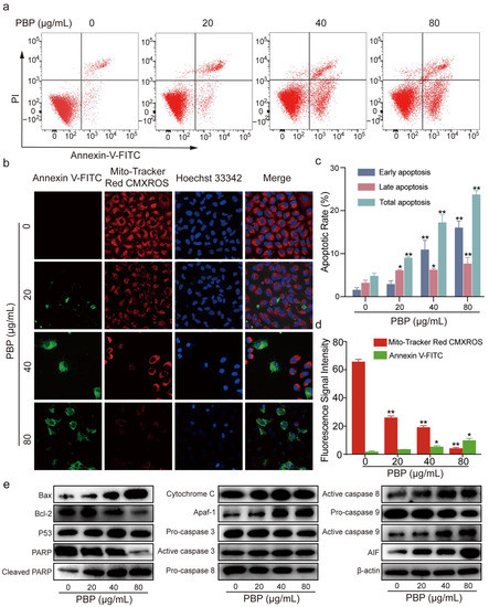 PBP induced apoptosis and caused MMP depolarization in A549 cells. (a) A549 cells were incubated with PBP (0, 20, 40 and 80 μg/mL) for 48 h and then stained with Annexin V-FITC and PI for evaluation by flow cytometry; (b) The MitoTracker Red CMXRos fluorescent probe was used to detect the MMP in A549 cells using a mitochondrial membrane potential detection kit and laser confocal microscopy; (c) Histograms of the apoptotic rates of A549 cells treated with PBP; (d) Histograms were used to determine the average fluorescence intensity; (e) Expression of apoptosis-related proteins was analyzed by western blot analysis. Data are presented as the mean ± SD (n = 3) by One-way ANOVA analyses. ** p < 0.01, * p < 0.05 versus control (0 μg/mL PBP).