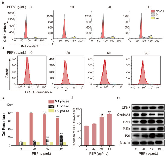 PBP arrested A549 cells in S phase and caused ROS production. (a) A549 cells were stained with PI and evaluated using flow cytometry after PBP (0, 20, 40 or 80 μg/mL) treatment for 48 h; (b) A549 cells were stained with the ROS indicator (DCF-DA) and analyzed by flow cytometry after PBP treatment for 48 h; (c) Analysis quantitative of the cell cycle distribution of A549 cells treated with PBP; (d) Quantitative analysis of the DCF fluorescence geomean in A549 cells treated with PBP; (e) Western blot analysis of proteins related to S phase arrest. Data are presented as the mean ± SD (n = 3) by One-way ANOVA analyses. ** p < 0.01 versus control (0 μg/mL PBP).