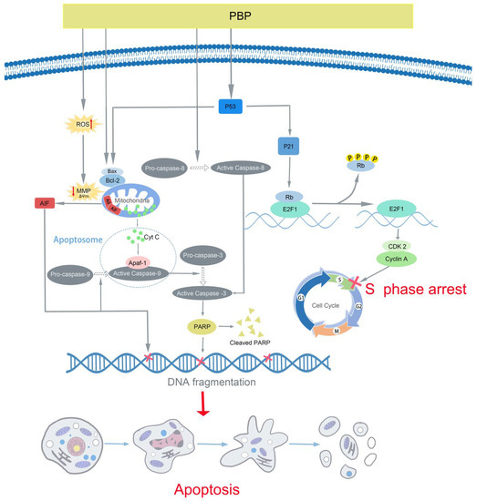 Previous studies have shown that ROS can be associated with a variety of cell cycle, apoptosis, autophagy pathway [44,45]. In this study, PBP induced ROS production and MMP depolarization (Figure 5b), indicating that it is a potential factor to promote apoptosis and S phase arrest in A549 cells.