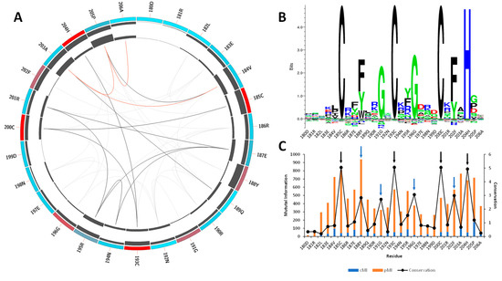 Mutual information and conservation analysis of the CCCH domain protein family. (A) Circos representation of the CCCH domain family. Square boxes indicate the KL conservation score (from red—highest values to cyan—lowest values). The cumulative mutual information (cMI) and proximity mutual information (pMI) scores are represented as histograms in the inner circle. Lines in the center connect pairs with a MI score higher than 6.5. Red lines represent the top 5%, black lines are between 95% and 70%, and gray lines indicate < 70%. (B) The KL sequence logo of selected nodes. (C) A histogram representing the conservation per residue, cMI and pMI , within 5 Å threshold. The black arrows represent the CCCH motif, and the blue arrows correspond to residues Phe188, Gly191, Gly196, and Phe202. The sequence id numbers correspond to those in the Circos representation.