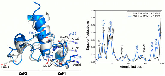 PCA analysis of the MBNL2 ZnF1/2 NMR ensemble revealed that the experimental global fluctuations are localized in charged and polar residues that are mainly characterized by Arg27, Arg31, Ser37, and Glu39 in the ZnF1 domain and Glu71 in the ZnF2 domain. These results are in line with the co-evolvability analysis, but the fact that the compactness of the protein is not dynamically conserved in both domains despite their high structural and sequence similarity is particularly interesting. The CCCH motifs present invariably low fluctuations, yet the high mobility of the conserved aromatic Phe43 residue is noteworthy due to its potential role in RNA binding. In fact, Edge et al. pointed out that alanine substitution in this position of ZnF1 of MBNL1 did affect its ability to activate splicing [12]. Computed MD fluctuations of the MBNL1 ZnF1/2 tandem were obtained using EDA and compared to the fluctuations of MBNL2 ZnF1/2. Interestingly, the PC1 of MBNL1 and MBNL2 yielded a modest correlation (Pearson correlation coefficient, r = 0.61), which suggests that both domains should have equivalent global low-frequency dynamics. Indeed, superposition of the fluctuations extracted from both tandems demonstrated that global fluctuations were localized into the same regions, following a similar trend (Figure 3). The inter-domain linker region of MBNL1 also exhibited high fluctuations due to the high mobility of its residues along the trajectory, especially on residues Pro73, His74, and Thr77. The highest fluctuations were observed in charged and polar residues next to the CCCH motif, as noticed before. These results show that, despite the large noise inherent to the technique, there is a good overlap in the behavior of AS control regions in both MBNL1 and MBNL2.